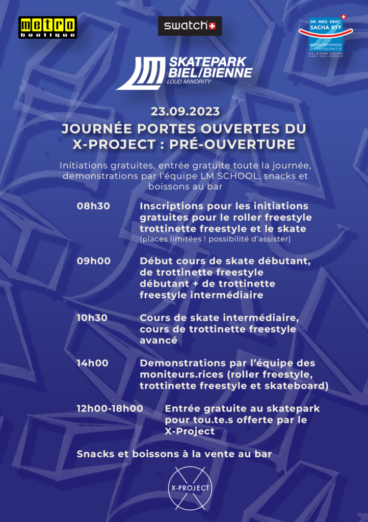 Venez pour les initiations gratuites pour le roller freestyle, la trottinette freestyle et le skateboard, pour des démonstrations de l’équipe des moniteurs.rices de la LM School, pour l’entrée gratuite au skatepark toute la journée et plus ! Nous nous réjouissons de pouvoir vous accueillir !